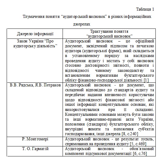 Складання аудиторських висновків є одним із найвідповідальніших моментів аудиту, оскільки цей етап передбачає підведення підсумків виконаних аудиторських процедур, узагальнення виявлених помилок, визначення їх сукупного впливу на фінансову звітність та висловлення думки аудитора про її достовірність, повноту, відповідність чинному законодавству. Аудиторські висновки та їх види, враховуючи їх важливість стали предметом дослідження численних вітчизняних науковців і практиків, таких як: Г. Давидов, Л. Кулаковська, О. Петрик, Ю. Піча, Т. Сєрікова, Б. Усач та ін. У російській економічній літературі слід назвати роботи Р. Алборова, В. Андрєєва, В. Воронова, О. Галкіної, С. Суворової та ін. Вивченню теоретико-методологічних засад складання аудиторських висновків присвятили свої праці такі іноземні вчені, зокрема Р. Адамс, Е. Аренс, М. Беніс, Ф. Дефліз, Г. Дженік, Д. Кармайкл, Дж. Лобек, В. О’Рейлі, Дж. Робертсон, М. Хірш та ін. Проте залишається багато невирішених і науково недосліджених проблем щодо складання аудиторських висновків в Україні. Для розкриття сутності та кращого розуміння поняття “аудиторський висновок” необхідно розглянути різні підходи щодо визначення його сутності. Неоднозначність думок щодо визначення даного поняття наведена у табл. 1. Аналіз табл. 1 дає змогу розкрити зміст поняття “аудиторський висновок”, який, в свою чергу, має місце не лише в літературних джерелах вітчизняних та іноземних науковців, а й у законодавчій базі України.