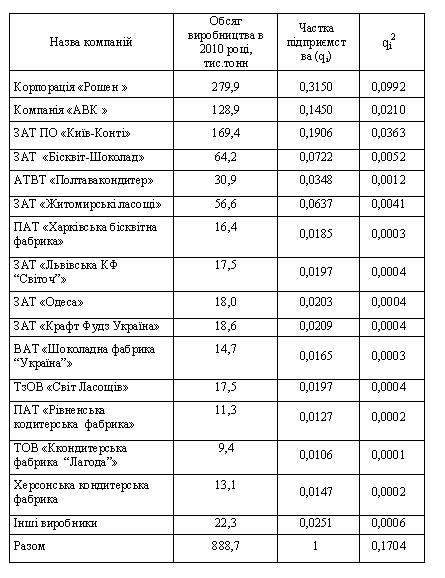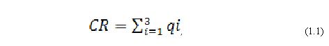 äå CR— ³íäåêñ êîíöåíòðàö³¿ íàéá³ëüøèõ òðüîõ ï³äïðèºìñòâ â ãàëóç³, %; qi— ÷àñòêà ïðîäàæó ³-ãî ï³äïðèºìñòâà, %. Ïðè öüîìó ââàæàºòüñÿ, ÿêùî ñóêóïíà ðèíêîâà ÷àñòêà 3-üîõ ï³äïðèºìñòâ CR < 45% – ðèíîê êîíöåíòðîâàíèé; 45% <CR< 70% – ðèíîê ïîì³ðíî êîíöåíòðîâàíèé; CR > 70% – ðèíîê âèñîêîêîíöåíòðîâàíèé (ìîíîïîë³çîâàíèé) [1, ñ.17]. Ðîçðàõóºìî ³íäåêñ êîíöåíòðàö³¿ ï³äïðèºìñòâ â êîíäèòåðñüê³é ãàëóç³: