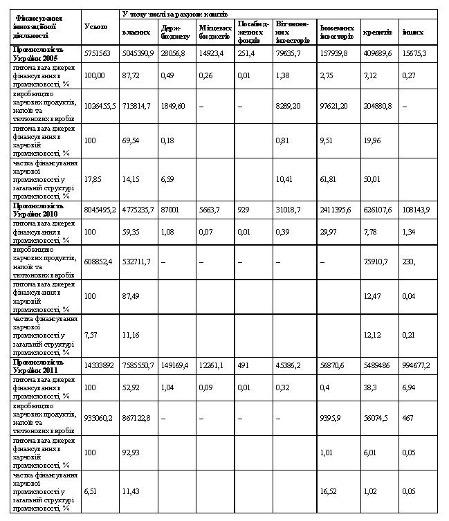 Загалом фінансування інвестиційної діяльності в промисловості України має тенденцію до зростання і найбільшу частку займає - за рахунок власних коштів, хоча щорічно ця частка зменшується у 2005 році вона складала 87,72%, у 2010 – 59,35%, а в 2011 – 52,92%. Це відбулося в результаті збільшення частки фінансування інноваційної діяльності за рахунок іноземних інвесторів у 2010 році та за рахунок кредитів – у 2011 році. Що стосується саме харчової промисловості то у 2010 році порівняно з 2005 обсяги фінансування інноваційної діяльності значно зменшились, але 2011 зросли з 608852 тис.грн. до 933060 тис.грн.. Відбувається суттєвий спад частки харчової галузі у структурі фінансування інноваційної діяльності підприємств всієї промисловості. У 2005 році вона становила17,85%, у 2010 – 7,57%, а в 2011 всього 6,51%. Хоча фінансування інновацій в промисловості в цілому зростає, в харчовій промисловості показники зменшуються. У 2005 році левова частка кредитних ресурсів та іноземних інвестицій промисловості в цілому припала на харчову і склала 50% і 62% відповідно. Це свідчить про її підйом – оновлення техніки та технологій виробництва саме за рахунок цих джерел порівняно з іншими видами промисловості. Але у 2010 іноземні інвестори взагалі перестали фінансувати інновації, а за рахунок кредитів, як джерела, цей показник склав 12%. У 2011 році навпаки, значно зросла частка фінансування у промисловості за рахунок іноземних інвесторів до 16,52%, а за рахунок кредитів значно зменшилась і складає 1%. Майже не змінюється частка власних коштів харчової галузі у структурі фінансування інноваційної діяльності підприємств всієї промисловості. У 2005 році вона становить 14,15%, у 2010 – 11,16% та в 2011 – 11,43%. Це свідчить про рівномірне інвестування в інновації за рахунок власних коштів у структурі всієї промисловості. Необхідно зауважити, що на підтримку інноваційної діяльності за останній період (2010 – 2011рр) спостерігається відсутність фінансування за рахунок вітчизняних інвесторів та держави у процесі нарощення інноваційного потенціалу галузі. Позитивним фактором є сприяння держави оптимізації амортизаційної політики підприємств і формування джерела фінансування на просте відтворення інноваційного характеру. У 2010 та 2011 рр зменшується питома вага фінансування за рахунок іноземних інвесторів та кредитів. Такі коливання частки кредитних коштів свідчать про їх нестабільну роль у інноваційних процесах у галузі. Підприємства вдаються до залучення кредитів виходячи із умов його доступності та потреб, що виникають. Жорсткі умови та короткі терміни надання кредитів, необхідність наявності застави, розмір відсоткових ставок тощо стримують використання цього джерела. Постійно зростає питома вага фінансування інновацій харчової промисловості за рахунок власних джерел, у 2005 році вона становить 69,54% у 2010 – 87,49%, а в 2011 вже 92,93%. Це свідчить про поступовий перехід харчової промисловості на самофінансування інновацій. Оскільки основу власних коштів підприємств харчової промисловості становлять нерозподілений прибуток та амортизаційні відрахування, можна зробити загальний висновок про зростання ролі й значення прибутку як потенційного ресурсу фінансування інноваційного розвитку підприємств галузі. Водночас, враховуючи поширену серед вітчизняних підприємств практику приховування реального прибутку з ме
