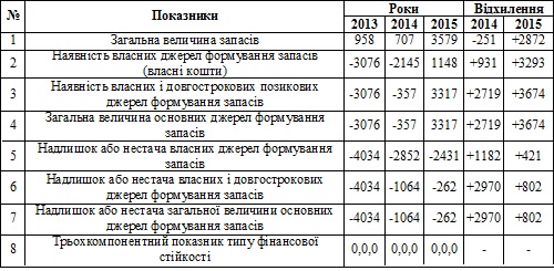 На основі проведеного аналізу слід відмітити, що фінансовий стан підприємства є кризовий, і характеризується дефіцитом основних джерел формування запасів і витрат, власних оборотних засобів та власних і довгострокових позикових джерел формування запасів, що свідчить про можливість його банкрутства. Проте спостерігається незначне покращення фінансової стійкості у 2015 році, що зумовлене збільшенням наявних власних і довгострокових позикових джерел формування запасів.