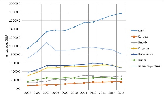 Рис. 1. Динаміка валового зовнішнього боргу країн «Великої сімки» у період 2005-2015 рр.