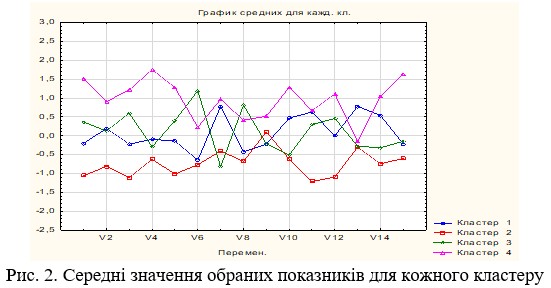Для ранжування виділених кластерів за рівнем розвитку сільського господарства використано аналіз середніх значень обраних показників в межах кожного кластеру (рис. 2).