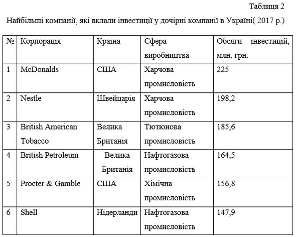 Незважаючи на складну ситуацію, на даний момент, в Україні функціонують 35 корпорацій, та вони підпорядковують собі приблизно 8 тис. філій та дочірніх підприємств. ТНК зосереджують свою діяльність переважно в таких галузях, як харчова, тютюнова та хімічна та нафтогазова. В Табл. 2 приведені найбільші компанії, які інвестують свої ресурси в Україну. Найбільший інвестор серед наведених- найвідоміша компанія в сфері харчової промисловості McDonalds, яка інвестувала у 2017 р. 225 млн грн. Передову позицію займають такі компанії, як Nestle, British American Tobacco, British Petroleum. (Табл.2) [3].