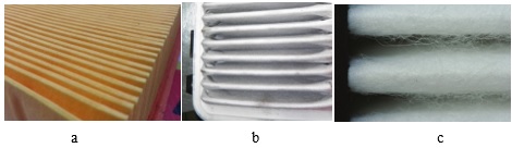 Fig.1. Air filters: a – traditional paper, b – non-woven fiber, c – texture of fibers when magnified