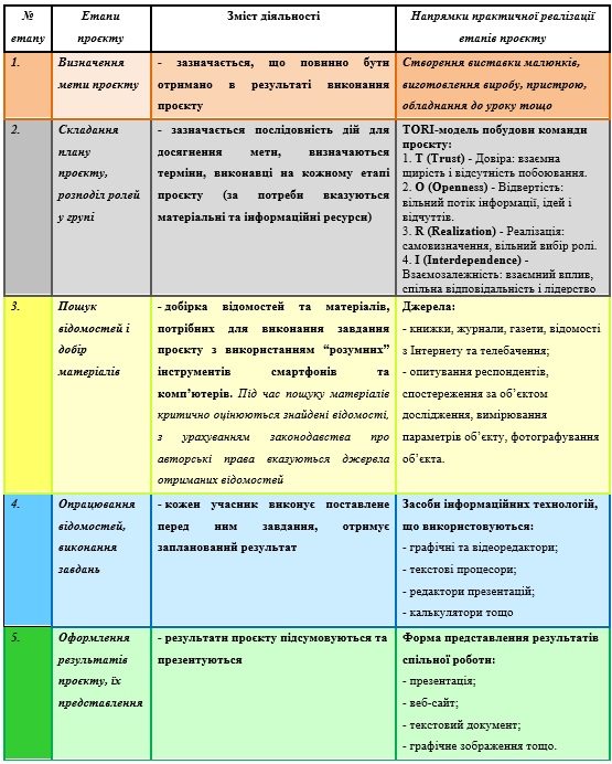 За матеріалами курсу формулюємо та ознайомлюємо учнів з базовими поняттями проєктної діяльності та порядком організації їх роботи для виконання проєкту, досягнення поставленої мети. Проєктна діяльність передбачає комплекс етапів (мал. 1).