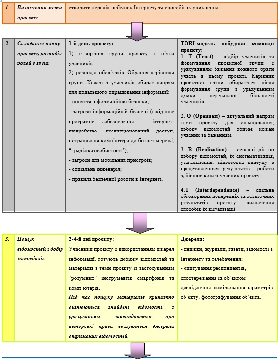 Розглянемо складання плану виконання проєкту з теми “Безпечний Інтернет” (освітні галузі: інформатична, освітня та здоров’язбережувальна) (мал. 3).