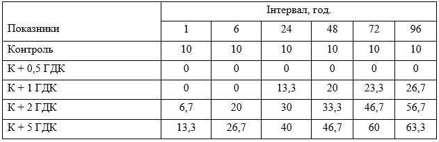 Таблиця 2. Динаміка зміни кольору личинок хірономід у %, за сумісного впливу важких металів (Купрум +Марганець + Цинк) упродовж 96 год