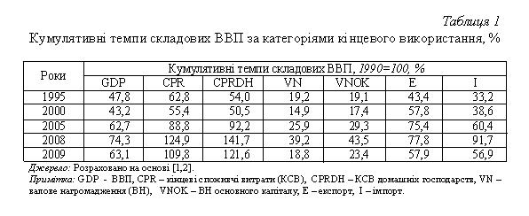 Аналіз наслідків впливу світової фінансової кризи на динаміку і струтуру ВВП за категоріями кінцевого використання і доходу показав, що реалізована модель соціально-економічного розвитку в Україні у 1991-2010 рр. з точки зору розширеного відтворення і макроекономічних пропорцій неефективна. Впродовж двадцятирічного економічного циклу загальний тренд її розвитку характеризувався скороченням національної економіки, переспоживанням за рахунок як поточного виробництва, так й створеного раніше національного багатства і кредитів, перевищенням імпорту над експортом, деградацією виробничого і науково-технологічного потенціалу. Кумулятивну динаміку складових ВВП у табл. 1 розраховано на даних у порівнянних цінах попереднього року. У 2009 р. ВВП становив 63,1%, валове нагромадження, зокрема, основного капіталу, відповідно, 18,8 і 23,4% 1990 р.